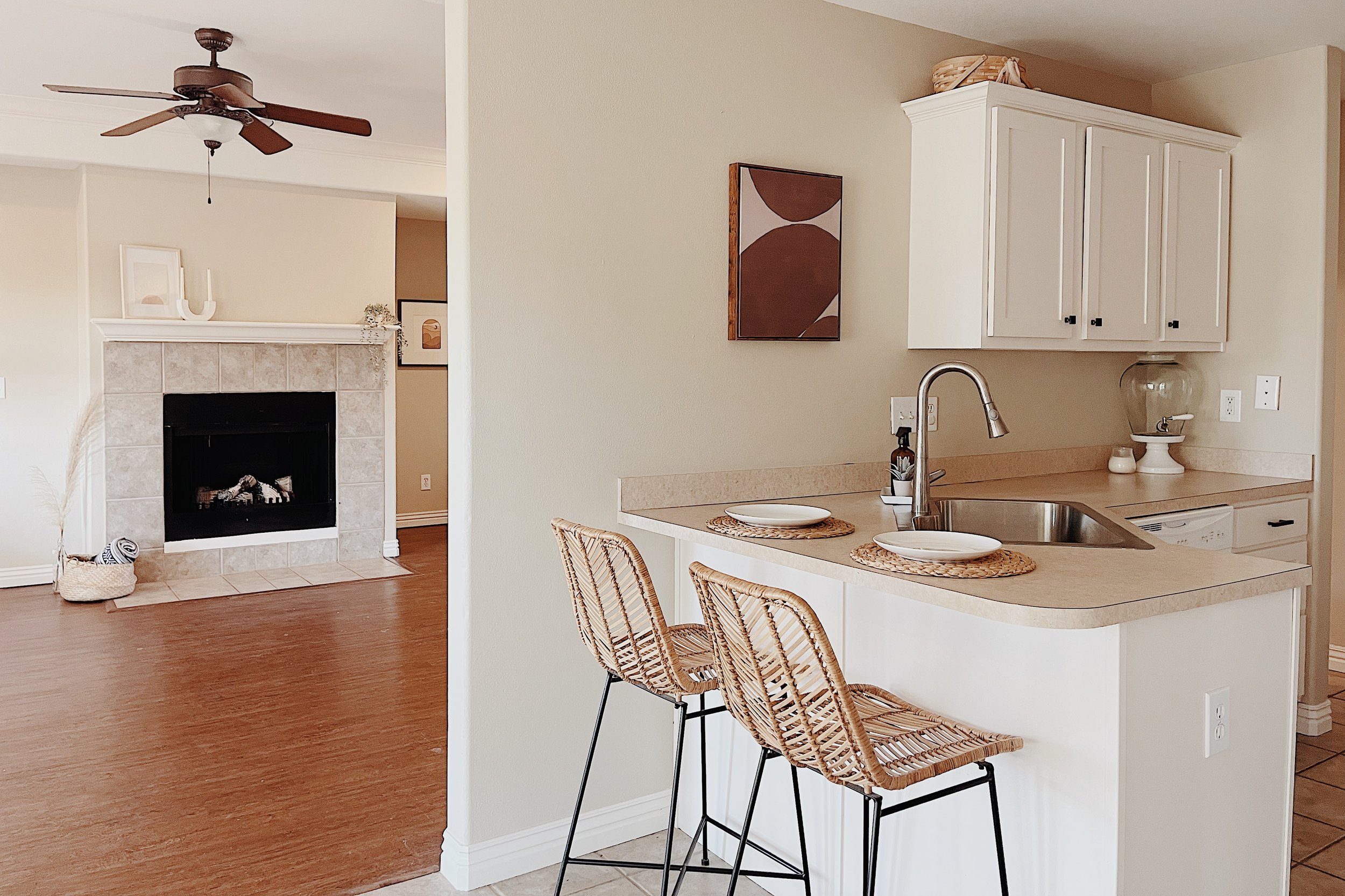 We use all our own home decor and accessories, but minimal furniture, (mostly smaller items like chairs, benches, side tables, etc) to make the home more inviting and to better showcase the home’s space. This includes renting our materials for 3 weeks, with an additional fee per week added.